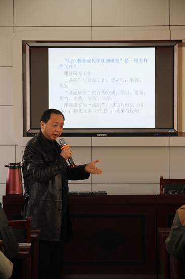教育部部长陈宝生在12月12日的“现代职业教育发展推进会”上明确指出:推进职业教育要牢固树立质量意识,质量是职业教育发展的生命线。为贯彻落实陈宝生部长的讲话精神,津市职教集团教职工越来越深刻地认识到,搞好教科研工作对提高职业学校的教育质量,提高职业学校教师业务素质水平起着非常重要的作用。为提升津市职教集团教科研课题的研究水平,促进教育教学质量的显著提高,从而达到“科研兴校、科研立校、科研强师、科研促教”的目的。12月15日,集团邀请了常德市教育科学研究院规划与发展研究室刘忠义主任,就如何稳步推进《中等职业教育现代学徒制实践研究》的研究工作进行了专题讲座。讲座由集团负责人周志波校长主持,集团课题组全体成员、集团教师代表及管理部门的相关人员和津市教育局教研室负责人、教育局所属中小学在研课题的主研人员参加了讲座。
